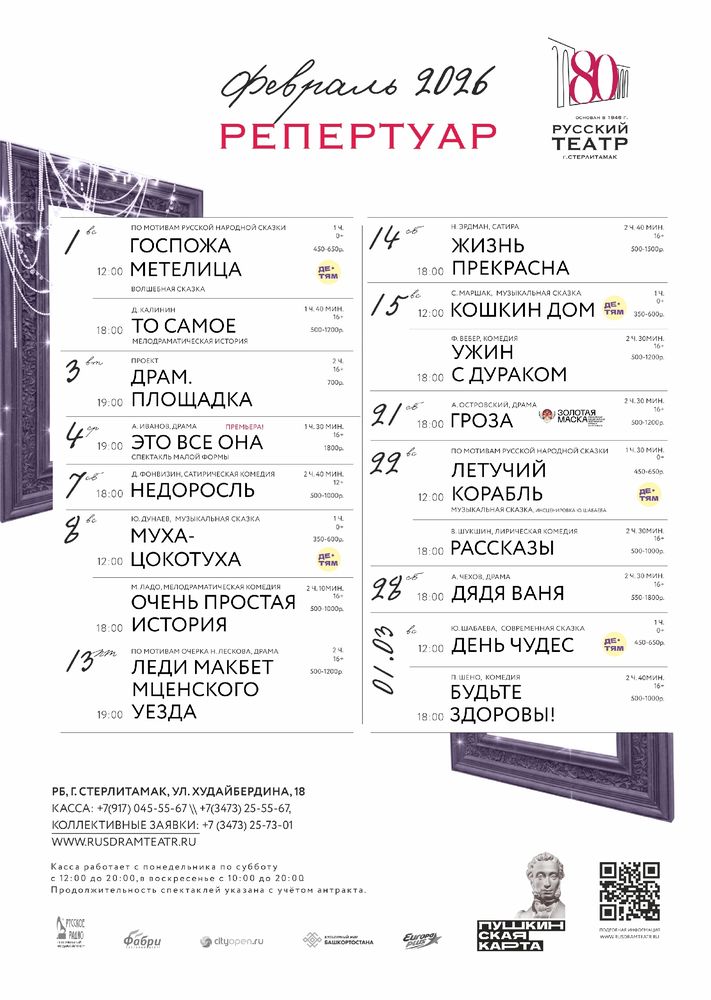 Репертуар на февраль 2026 Русский драматический театр г. Стерлитамак