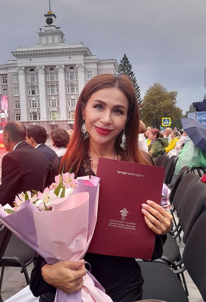 Высокую награду за личный вклад и популяризацию культуры в Вооружённых силах РФ и укрепление межрегиональных культурных связей вручила начальник отдела культурных программ Департамента культуры Министерства обороны РФ Ольга Фаллер.