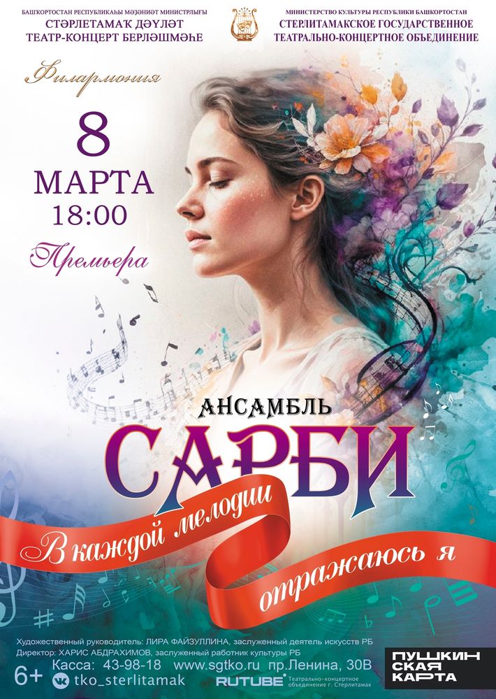Россия, Республика Башкортостан – 8 марта 2026г. в 18.00 на сцене Стерлитамакского государственного театрально-концертного объединения состоится праздничная премьера «В каждой мелодии отражаюсь я» чувашского эстрадно-фольклорного ансамбля «Сарби».