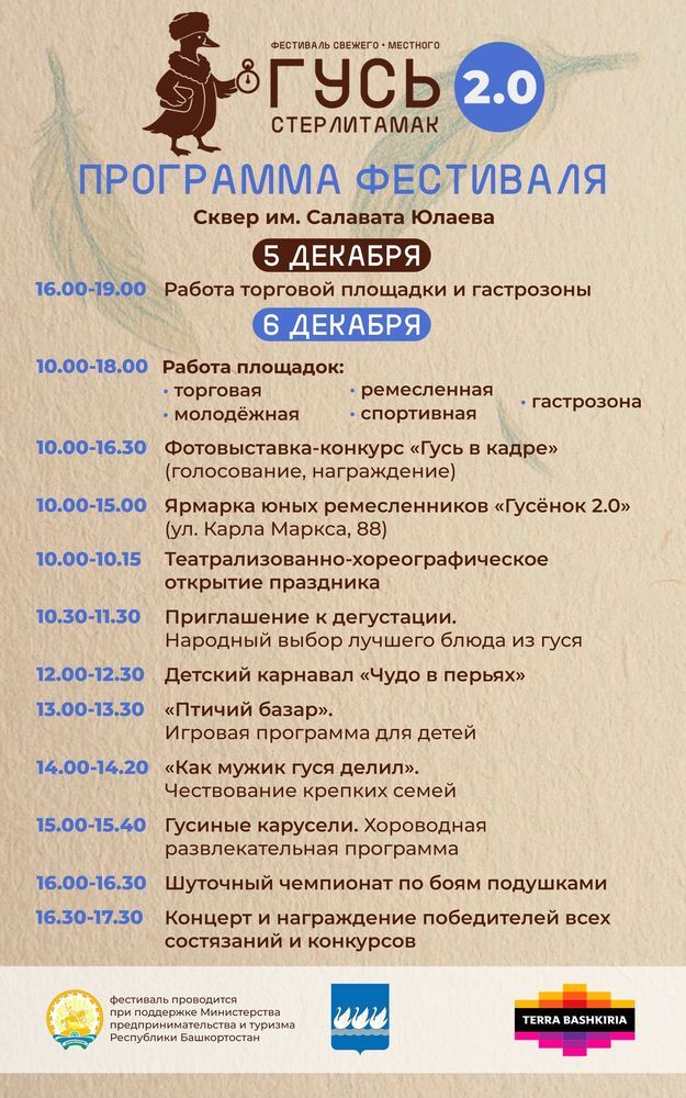 5 и 6 декабря в Стерлитамаке впервые пройдёт уникальный фестиваль «Гусь 2.0», который включает в себя гастрономию, ремёсла и культурные развлечения. Он состоится в исторической части города – в сквере им. Салавата Юлаева. Основной день мероприятия – 6 декабря.