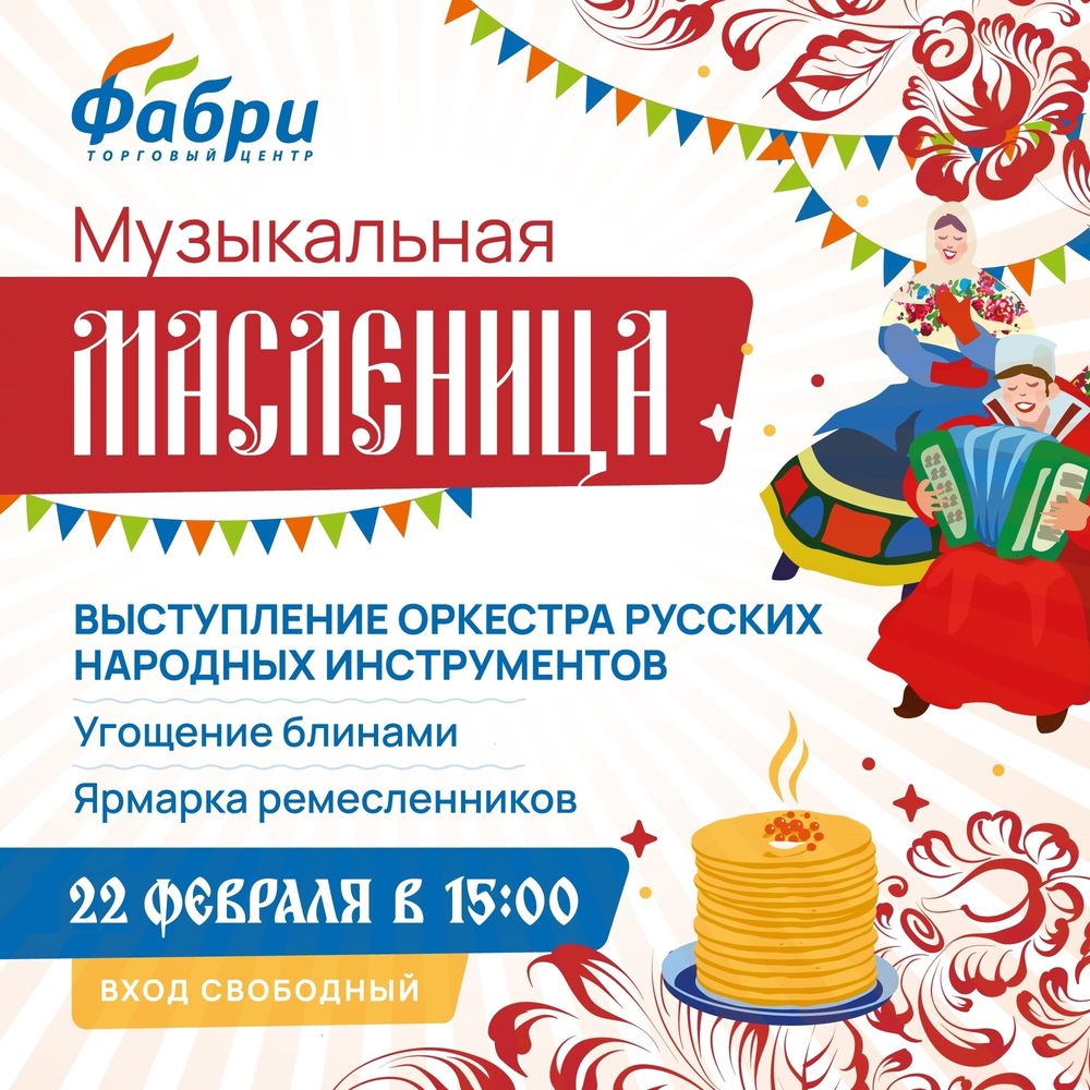 22 февраля в 15.00 оркестр русских народных инструментов филармонии театрально-концертного объединения под руководством главного дирижёра заслуженного артиста РБ Артёма Болотова приглашает на яркий и по-настоящему народный праздник – Масленицу! Место встречи – ТРЦ Фабри.
