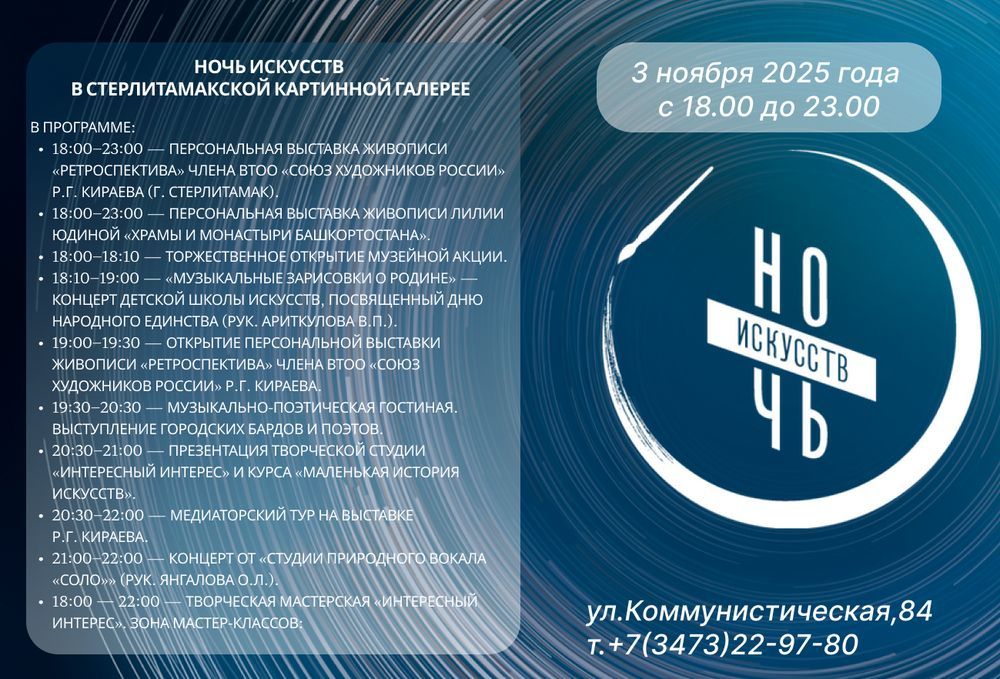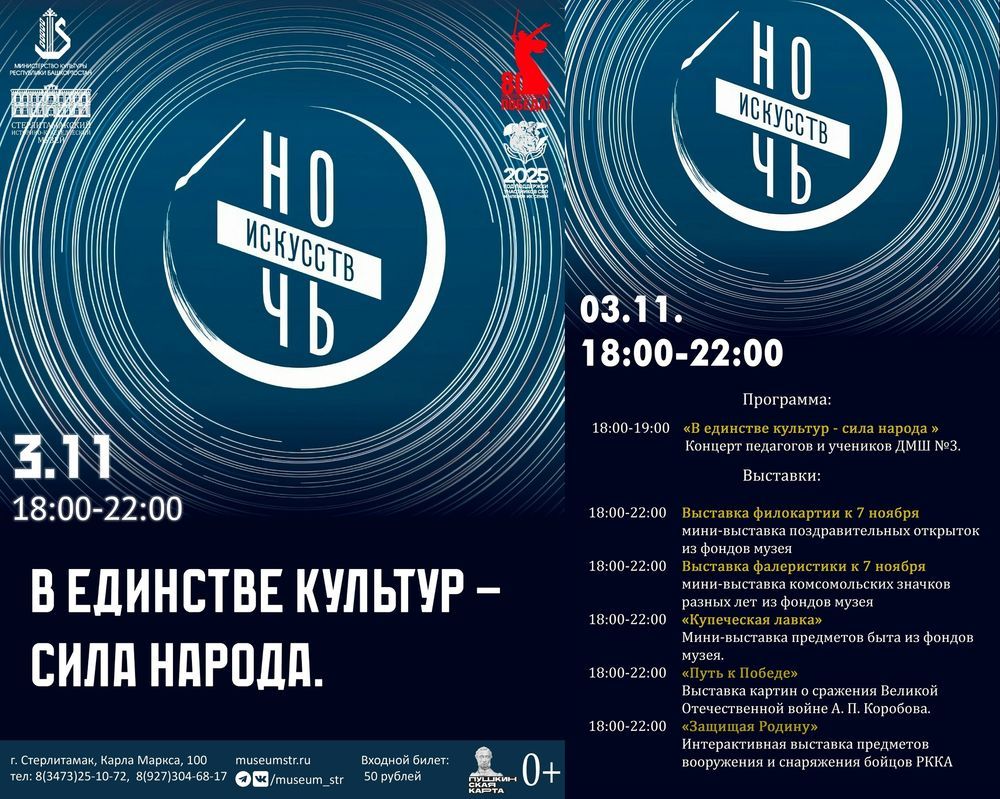 3 ноября 2025 года во всех регионах России пройдет традиционная ежегодная акция «Ночь искусств». В этом году ее мероприятия будут приурочены ко Дню народного единства и пройдут под девизом «В единстве культур — сила народа». В учреждениях культуры запланированы тематические мероприятия. Подробности в карточках.