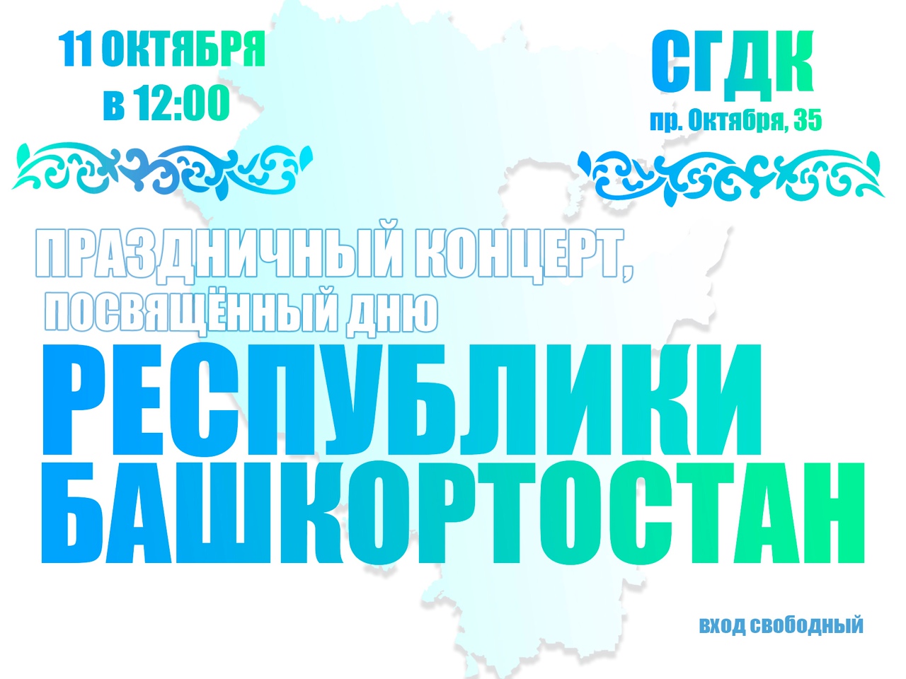 11 октября в 12:00ч. в Стерлитамакском городском Дворце культуры (пр. Октября, 35) состоится праздничный концерт, посвященный Дню Республике Башкортостан!