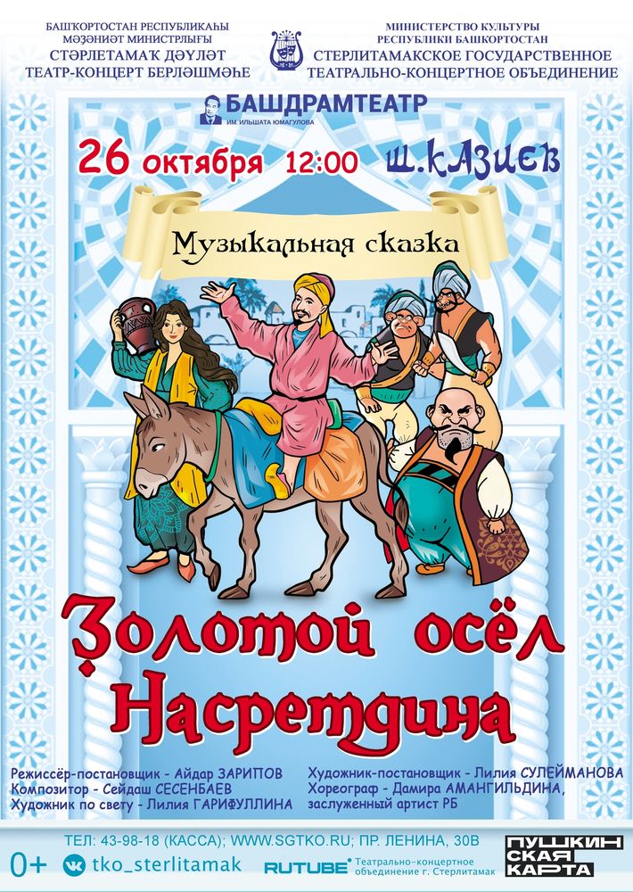 26 октября в 12.00 башкирский драматический театр им.Ильшата Юмагулова СГТКО приглашает на музыкальную сказку «Золотой осел Насретдина»
