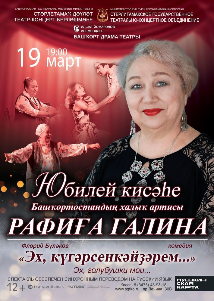 19 марта в 19.00 башкирский драматический театр им.Ильшата Юмагулова приглашает вас на спектакль с участием народной артистки РБ Рафиги Галиной «Эх, күгәрсенкәйҙәрем…» (Эх, голубушки мои…) по пьесе Флорида Булякова.