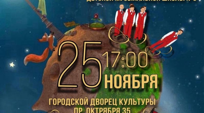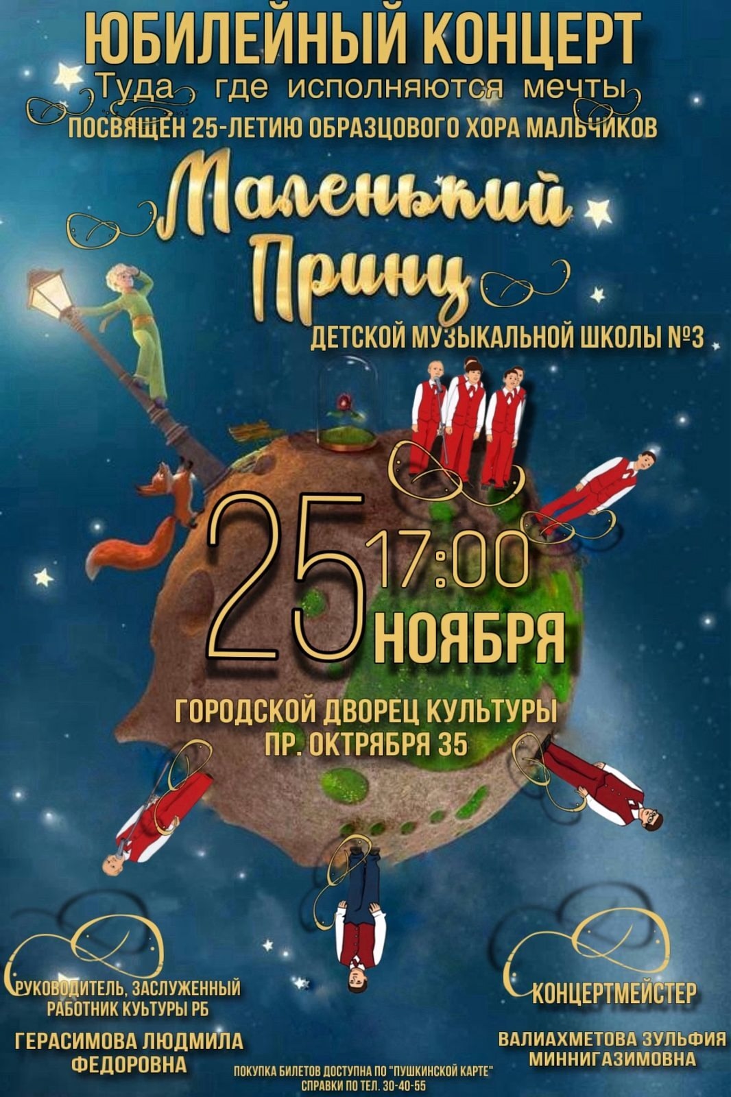 25 ноября в 17.00 в концертном зале Городского дворца культуры (Пр.Октября 35) состоится Юбилейный вечер, посвященный Образцовому хору мальчиков «Маленький принц» Детской музыкальной школы №3.