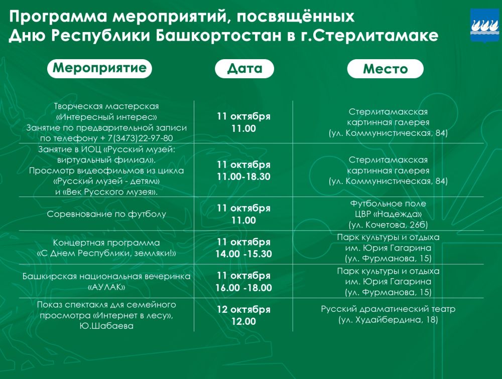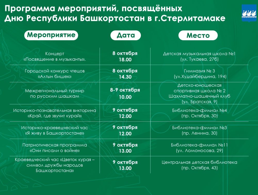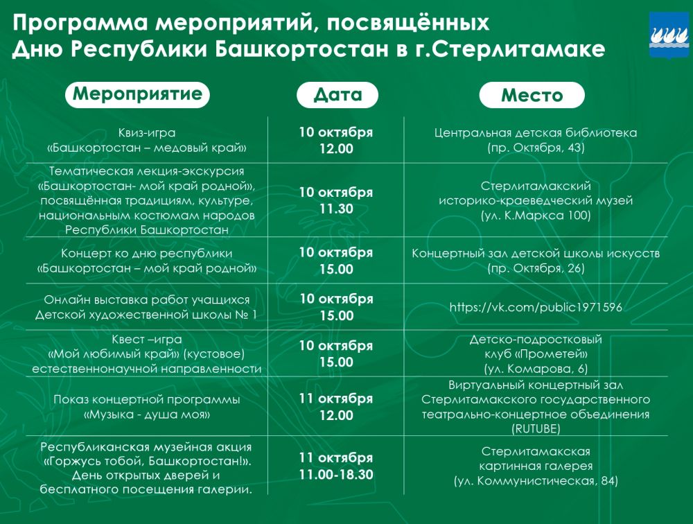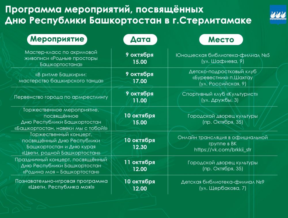 Анонс 11 октября Башкортостан отметит День республики 02.10.2025 Отдел Культуры города Стерлитамак Программа мероприятий, посвящённых празднованию этого события, — в карточках. #ДеньРеспубликиБашкортостан